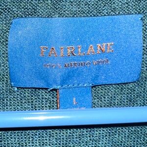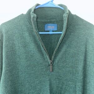 Fairlane men’s green zip-up sweater, designed for both style and comfort. The rich green color and 100% merino wool material make it a versatile choice for any occasion, from casual outings to business casual settings. Its ribbed cuffs and hem provide a refined finish to this timeless piece. Size L