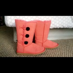 Beautiful salmon colored bailey button uggs. They were given to me as a gift, I believe they are not authentic. I'm a size 7 however these boots fit fine. I'm selling them because I'm moving to Florida and I won't be needing winter boots :(