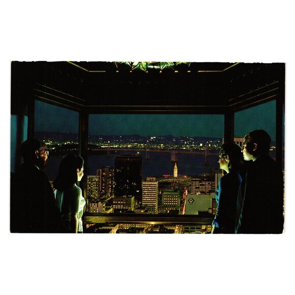 Vintage postcard featuring breathtaking San Francisco nightscape seen from the Fairmont Hotel. Highlights the scenic Sky Lift experience. Perfect for collectors and enthusiasts!