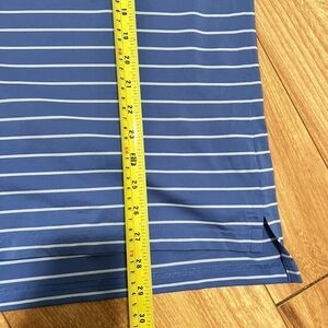 Made from a polyester blend fabric, this blue striped shirt is perfect for golfing or tennis with its moisture-wicking and breathable features.