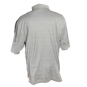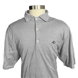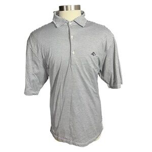 Fairway & Greene Men’s Grey with Navy Blue Stripes Embroidered Dog Logo 3-Button Moisture Wicking 100% Mercerized Cotton Short Sleeve Golf Polo Shirt Size XL. This polo is preowned and in very good condition.