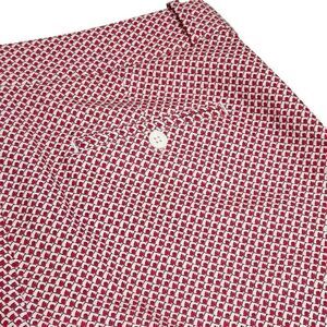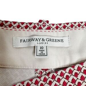 Fairway & Greene pink and white print Bermuda golf shorts size 10. Front and back pockets. Great condition. 90% polyester 8% spandex. Waist 16.5” Rise 10.5” Inseam 11.5”.