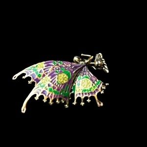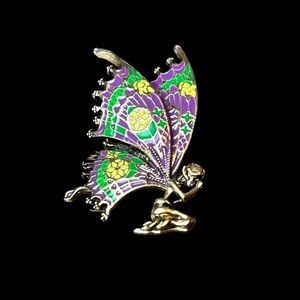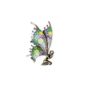 Brooches are another big trend for spring summer 2024 by collecting and adding multiple pins to jackets, denim, blazers, sweaters, and even dresses and pants! Fairy Brooch kneeling and praying with a goldtone base and beautiful dimensional wings with colors that include purple, green, yellow and gold. Feminine and a true Fairycore statement. A wonderful gift for yourself or someone who love the Fairycore vibe or even collects faires! The brooch has a deep c closure and measures 2” tall and 1 1/2” wide. 🧚♀️ NWOT