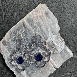 Earrings of faceted dark blue gems (may be lab created) in 925 silver plated boho or fairy core ornate styled floral leaf and heart settings with 925 ear wires.