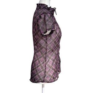 Fairy Grunge Whimsigoth Purple Plaid Sheer Short Sleeve Blouse With Tie Neck 8
