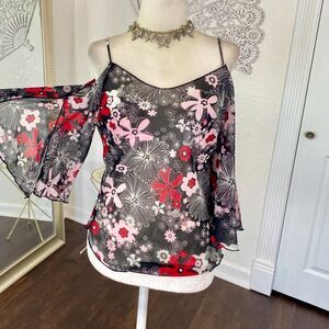 Fairy Whimsygoth Semi Sheer Off The Shoulder Bell Sleeve Floral Flower Top S