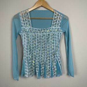 Fairy Y2K Turquoise Sheer Chiffon Lace Sequin Top XS/S Square Neck Peplum Ethere