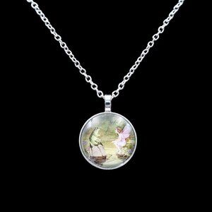 This Fairy and Frog Necklace has a sweet frog and fairy sitting on the pond. This whimsical necklace is simple, fun and would be a nice addition to many outfits.