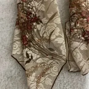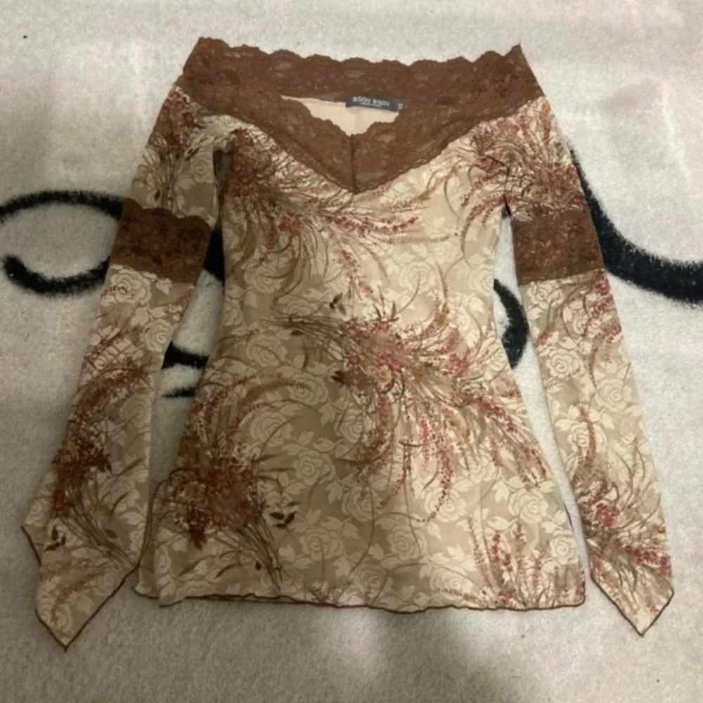 Off the shoulder fairy sleeve top. I love this top so much it says a size XS but can fit up to a medium it’s very stretchy. There is a beautiful pattern around the sleeves and all over the top