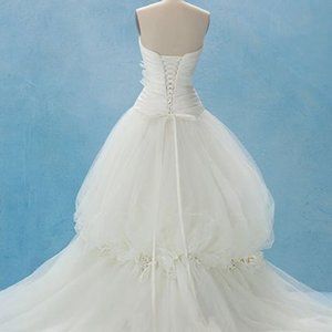 This tulle ball gown with its delicately draped satin bodice pays tribute to Snow White's gentle grace and beauty. Hidden in the skirt's pickups are lace vine motifs and romantic flowers that seem to come straight from her enchanted forest.