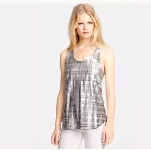 A silvery finish and finely textured plaid pattern give modern punk-rock edge to a lightweight leather tank.