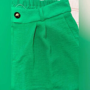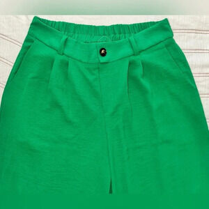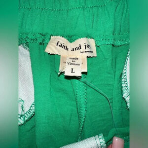 This women's green two-piece set includes a casual shirt and pants with a wide-leg style. The outfit is made of 100% polyester chiffon fabric, which makes it breathable and comfortable to wear in all seasons. The elastic waist and high waist provide a relaxed fit, while the pleated and button accents add a touch of elegance. The set is perfect for various occasions, such as travel, parties, and business meetings. It comes in a solid green color, making it a great choice for a festival, movie, or botanical-themed outfit. The garment care is easy, as it is machine washable. This Faith And Joy brand outfit is a great addition to any wardrobe, whether you're a teacher, student, or professional.