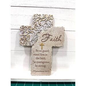 Decorative “Faith” wall cross featuring 1 Corinthians 16:13 — “Be on guard; stand firm in the faith; be courageous; be strong.” Stone-look composite with raised detailing. No hanging hardware included. Display on a shelf or add your own hook/wall hanger.