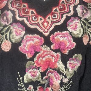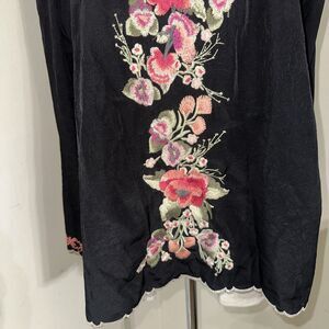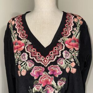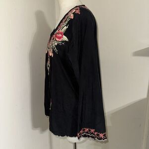 Faith & Zoe Black Shirt Top Embroidered Accent Pink Green Floral Size Large EUC