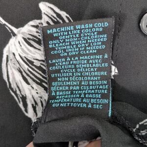 * Features: Sheer material (no inner lining) in black with white floral designs, button front closure, long puff sleeves with button cuffs, flowy, collared