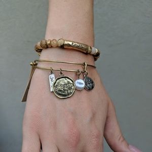 Beautiful bracelet set! The natural stone bracelet has a gold bar that says Faith and gold beads scattered amongst the natural stones. The natural stones are tans, peaches and cream.The other bracelet which is modeled after an Alex and Ani has several dangles - a silver that says LOVE, a gold that says BLESSED and one that says Bless Your Heart. These fashion bracelets stretch and will fit all wrist sizes. All of our bracelets are new, some have tags and some did not come with tags.