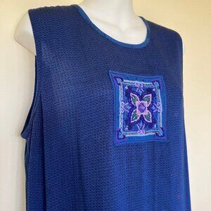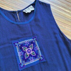 Vintage Faith by Celia Forrester sleeveless maxi dress has beautifully beaded applique on the front of chest. Body of dress has subtle texture to fabric with small geometric square pattern. Bottom of dress has print panel around the hem. Pullover style with single button closure at back of neck, back kick vent for ease of movement. Tag doesn't note fabric content - feels like a polyester blend. Tag size is women's Medium , see below for garment measurements. Good pre-owned condition, light signs of wear.