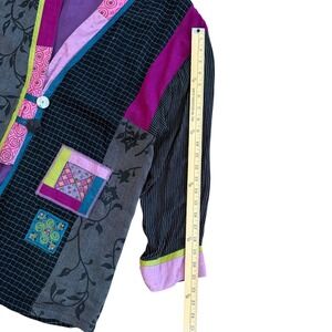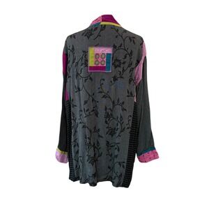 Discover artistic flair with this unique Faith by Celia Forrester patchwork kimono jacket. This captivating piece boasts an eclectic mix of textures and patterns, creating a visually stunning statement. Intricate floral motifs weave across a textured grey background, contrasted by bold grid patterns and vibrant abstract squares. The open front is framed by a colorful, multi-toned trim that draws the eye, while the cuffs and collar feature playful, circular patterns. Designed for comfort and style, this jacket offers a relaxed silhouette that drapes beautifully. Perfect for adding a touch of avant-garde charm to your everyday look, elevating a casual brunch outfit, or serving as a conversation starter at an art gallery opening.
