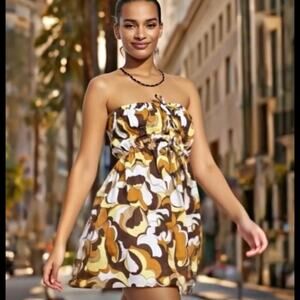 This strapless style combines comfortable elastic through the bodice, a gathered mini length skirt and tie detailing across the bust.