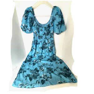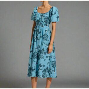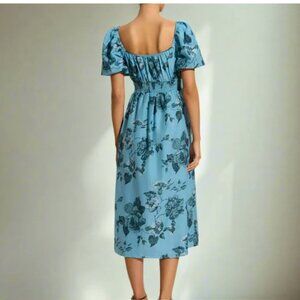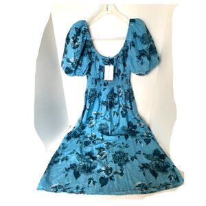 Faithfull The Brand Avera Floral Midi Dress Small Blue Cotton Short Puff Sleeve