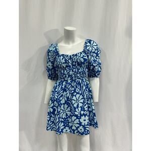 Faithfull The Brand 'Marinelli' Blue Cotton Mini Dress Size XS: unlined, pull-on styling, smocked bodice, puff sleeves with elastic cuffs, lightweight poplin fabric.