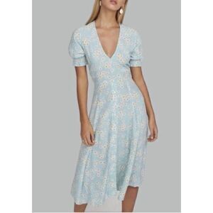Faithfull The Brand Mejia Zhoe Floral Daisy Midi Crepe Dress Blue US 8