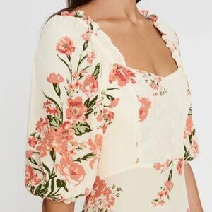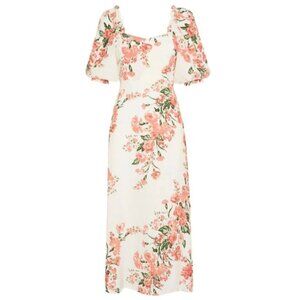 Faithfull The Brand Midi Dress Cream Pink Floral Short Puff Sleeve ALine Bronte