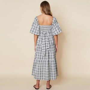 Cut in a luxe 100% cotton poplin, this dress features a free-flowing, tiered hemline, puff sleeves and a concealed side zip, finished with a backline tie.