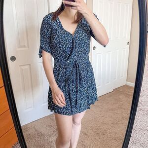 Features short sleeves, crossover V neck, tie waist, 2 button closure to adjust waist size, mini above knee length, ditzy floral navy blue print