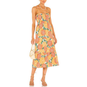 Faithfull The Brand 'Shaloom' Yellow Linen Midi Dress Size S: partially lined, hidden zipper closure at side, smocked elastic waist, adjustable straps.