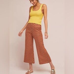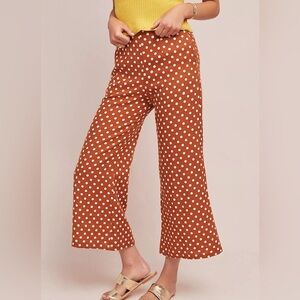 Cropped, wide-leg pants make an ideal transeasonal piece- pair with a silk cami and heeled sandals for warmer days and a knit pullover and flats when the weather cools. In excellent preowned condition. No signs of wear. Rust Orange & White Colors Polka Dot Print High Rise Lightweight Textured Linen Fabric Wide Leg Fit Cropped Length Concealed Back Zipper Closure Front Side Pockets Previously Sold on Anthropologie