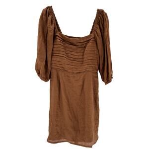 Faithfull The Brand 'Venezia' Brown Linen Shirred Pintucked Linen Midi Dress Size L: a pintucked bodice framed by puffed sleeves, with a shirred panel at the back to create a close fit.