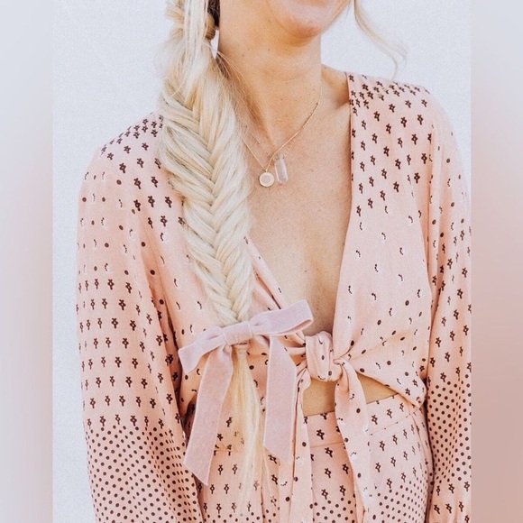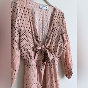 Pretty and lightweight pink dress with a delicate floral pattern. It has a cute tie-front detail and an elastic back waist that makes it super comfortable to wear. The sleeves are cropped with gathered cuffs for a relaxed look. Made from 100% rayon, so it’s soft and breathable.