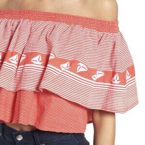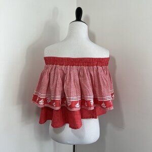 Elevate your casual wardrobe with this stunning Faithfull the Brand Sundown Off the Shoulder Top in a beautiful Red color with a white sailboat print. The top features a relaxed fit, ruffle accents, and short off-shoulder sleeves, making it perfect for all seasons. Made of 100% cotton and woven fabric, this blouse is comfortable to wear and easy to care for with hand wash only.