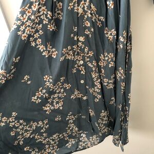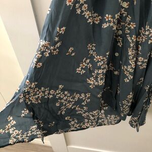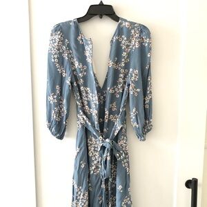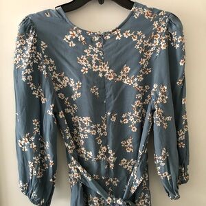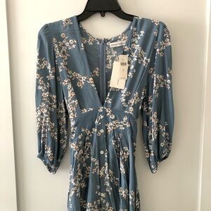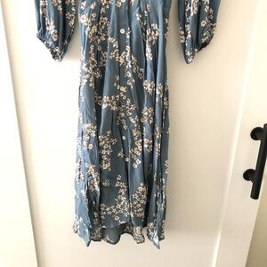 Elegant blue dress with floral pattern. Features a V-neck and puff sleeves. Perfect for any occasion.