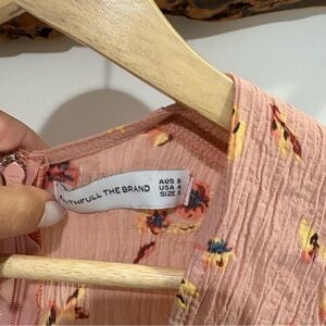 Elegant blush dress with vibrant floral design. Perfect for any occasion.