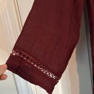 Super pretty FTB dress. Lovely burgundy color. Lined to about knee length and then there are slits on each side of the dress, allowing for ease of movement. Smocked neckline. Beautiful! In really good condition. The only flaw is that there appears to have been some sort of tie at the waist that has been removed. Hardly noticable. See last picture. Otherwise perfect!! Size XS.