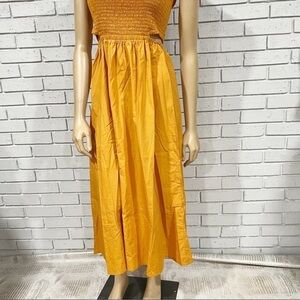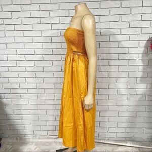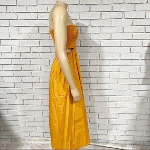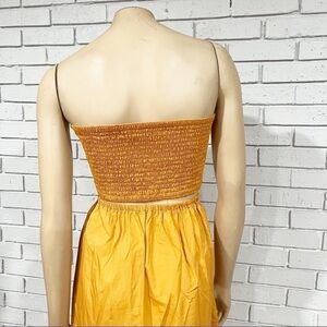 Easy wearing by design, this strapless style has been cut from a lightweight, crisp Cotton Poplin. Color is listed as orange, looks like a dark yellow.