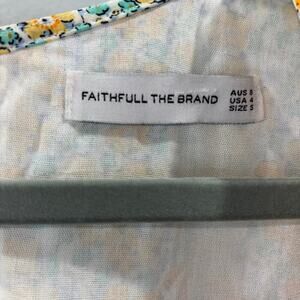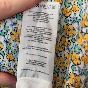 Embrace sweet cottagecore style with this gorgeous Faithfull the Brand midi dress in a soft yellow and blue floral print. Made from 100% rayon, it features a flattering empire waist, tie-front bodice, and puff sleeves. Feminine, lightweight, and ethically handmade in Bali, this dress is perfect for picnics, vacations, brunch, or any sunshine-filled day.