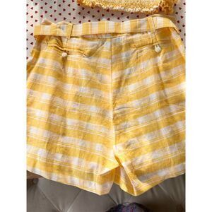 Keywords: Faithfull the Brand, yellow outfit, women's summer set, casual wear, cropped top, high-waisted shorts, breathable fabric, trendy summer, striped pattern, puff sleeves, shirred detailing, functional pockets, size 12, NWT, pullover closure.
