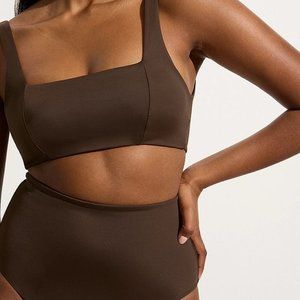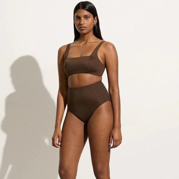 The Zizi Bikini Top offers a timeless bralette silhouette with a flattering square neckline, wide shoulder straps, removable cups and a gold clasp closure at the back. The Afonso Bikini Bottom in Coffee Brown boasts a flattering high-rise waist and fuller rear coverage.