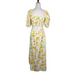 Faithfull the brand Loucetta size 4 white yellow orange floral Palermo print women's puff sleeve smocked top midi dress. New with tags, fully lined & fits true to size. This dress is ready for it's next wedding, special event or party. See pictures for flat lay measurements. Smoke free, pet free, quick shipping, MAKE OFFERS!