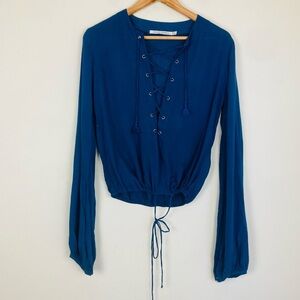 Faithfull the Brand X Revolve Shrimpton deep blue top. Lace up front neckline. Drawstring at hem and oversized sleeves gathered at cuff. Size small.