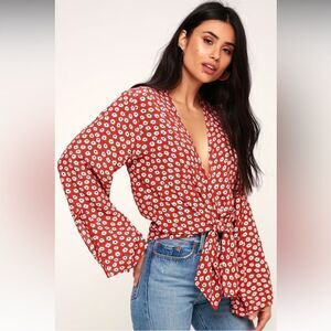 Keywords: Faithfull the Brand top, Teguise tie-front top, red floral blouse, bohemian top, women's size 6 top, summer blouse, tie-front blouse, bell sleeve top, designer top, lightweight top