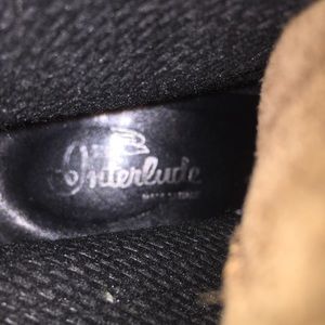 Well loved booties with super comfortable rubber heel. They squish slightly when you take a step which make them fun to walk in. Some slight imperfections that aren't super noticeable.