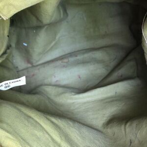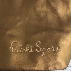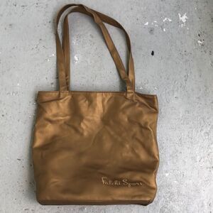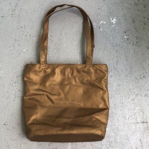 Faux leather tote that is in good condition on the outside but inside needs cleaning. Easily throw this into the washing machine. Measures approximately 12.5. I 13.5 x 4.5, handle drop is 12.5. Color is like a bronze
