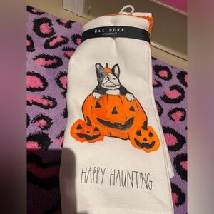 And a NWT Rae Dunn 3 piece kitchen towel set. 2 white towels with dog design and one solid orange towel.