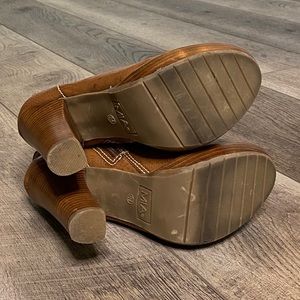 These heels make the legs look long. 5” from bottom of heel to the highest part the back heel. Love them but need to simplify. My foot fits 8.5-9 for reference.