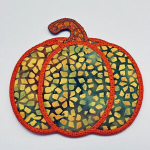 Add a touch of seasonal charm to your home with this set of four handmade coasters. The pumpkin embroidered design is perfect for Thanksgiving or Halloween and the quilted fabric material ensures durability. These round coasters are both functional and decorative, featuring a washable design for easy maintenance. The set includes four coasters and is a great addition to any kitchen or dining table. Made in the United States, this coaster set is a must-have for any home decor enthusiast.