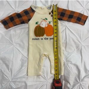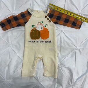 Three piece fall attire for baby! Unisex. Halloween pajamas are 0-3 months but the “cutest in the patch” and pumpkin jumper have no size label - I would estimate a 0-3 months size too based on how my baby wore them.